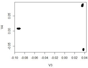 2. Use plot() on the columns you’re interested in. Top eigenvector will be in column 3 while second eigenvector will be in column 4, etc.. Therefore, if you want a set of pairwise plots covering the top 4 eigenvectors, you can use “plot(eigenvec_table[3:6])”.